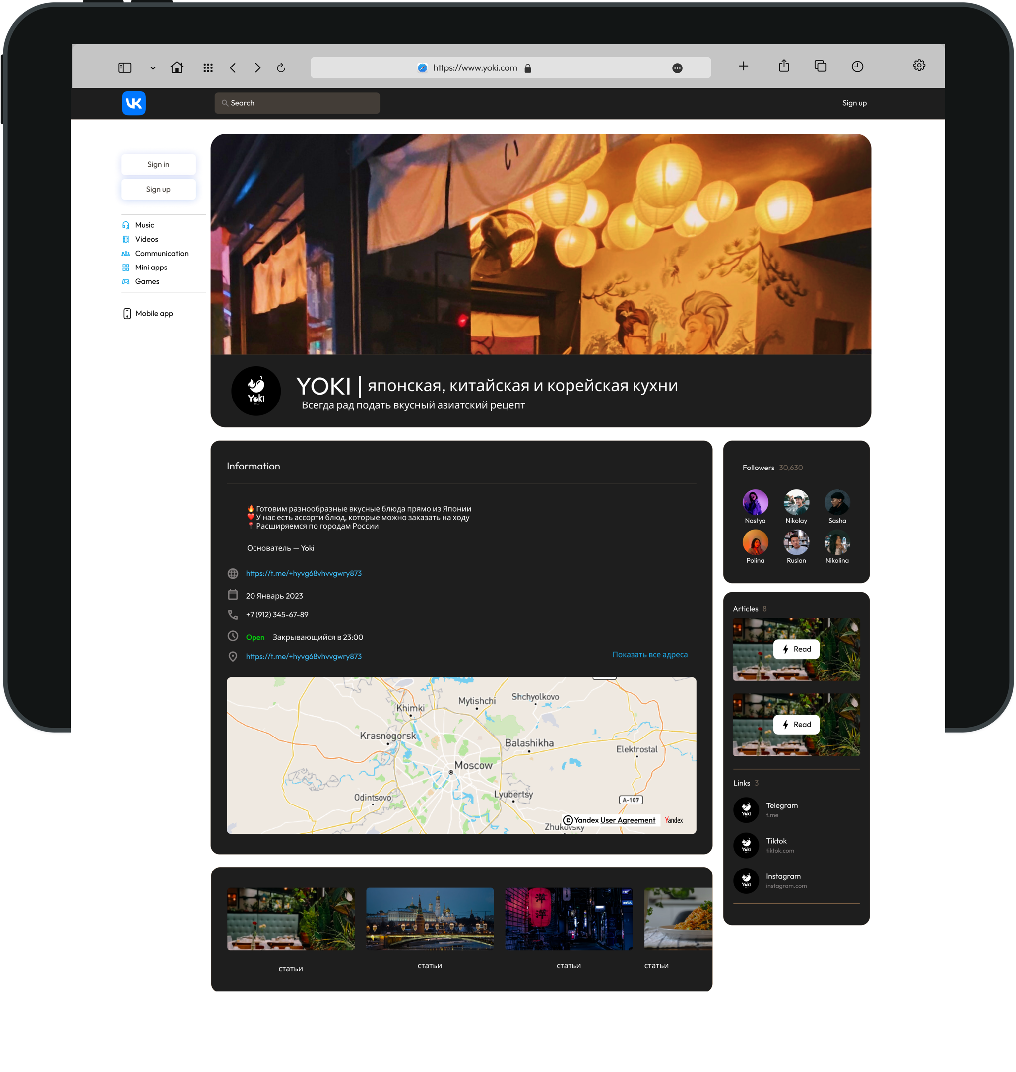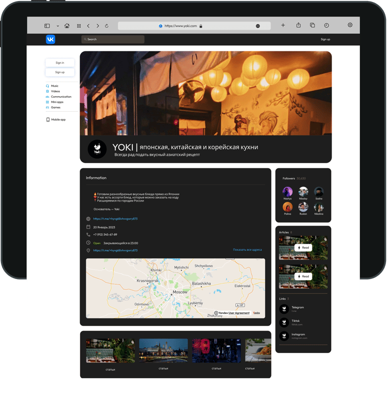 I designed the VKontakte page of the Yoki brand to show how the restaurant would leverage the power of the new branding on VK, and how the logo would look like on the social media.